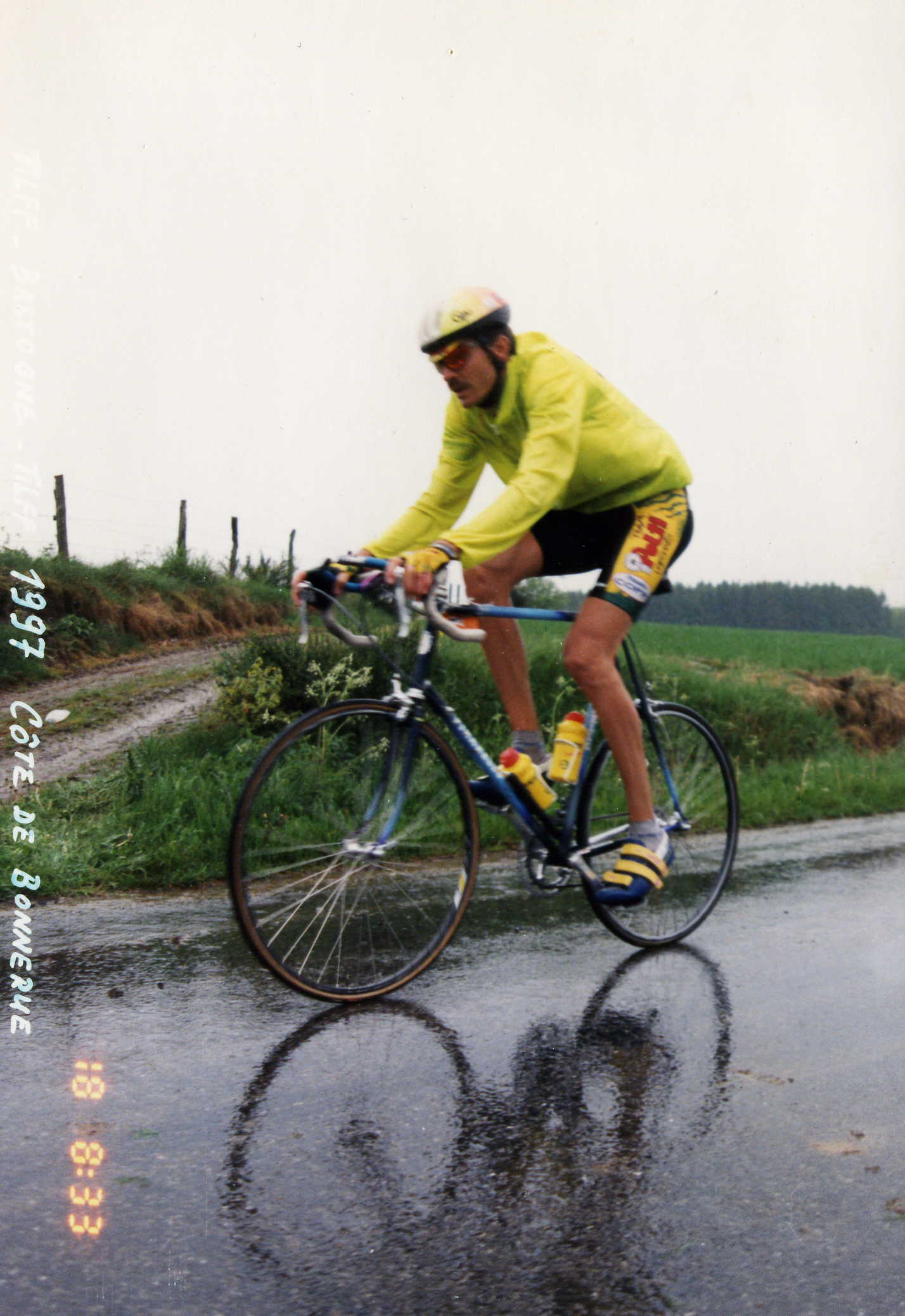 Zur Motivitation noch ein altes Foto aus dem Jahre 1997 von meiner Teilnahme bei Tilff – Bastogne – Tilff mit absoluten Schmuddelwetter. Damals ging es knapp über 8 Stunden bei Dauerregen und gefühlten 3 Grad durch die Ardennen ……..