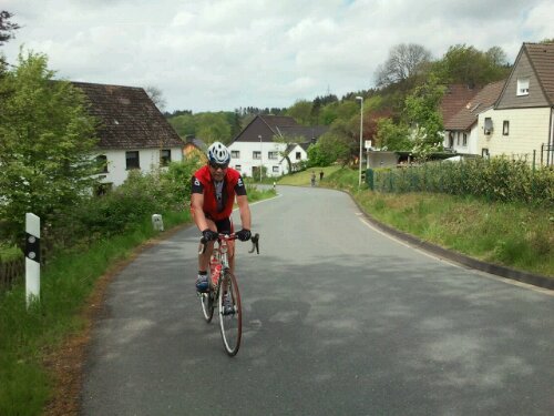 Gestern stand die oben genannte RTF mit Start und Ziel in Schwelm an. Durch die Teilnahme im letzten Jahr wussten wir, dass uns eine wirklich tolle Strecke erwartet. Zumindest auf der 100er Runde. Meine Recherchen hatten aber auch die Zusatzschleife für die 150er Runde als durchaus sehenswert und fahrbar kategorisiert 😉 So machten wir uns um kurz nach 9 auf die Reise. Zunächst in einem Pulk ging es nach einer kurzen Abfahrt über die Holthauser Talstraße stetig steigend hinein in´s Bergische Land. Hier war das Tempo aber schon grenzwärtig für Fitty, so dass er abreisen lassen musste. Unsere Devise „Hauptsache ankommen“ war klar vorgegeben und an diese hielten wir uns auch. Aussagen wie „Ich weiss nicht ob ich das durchhalte“ wurden konsequent ignoriert und mit motivierenden Worten überspielt…….. Und es half…… Fitty hat sich durchgebissen……. Nach der Holthauser Talstraße ging es eine Zeit über die B483 bis an den Ortsrand von Radevormwald. Hier war die Strecke geprägt von stetem Auf und Ab. Eigentlich ganz nach meinem Geschmack, aber auch irgendwie zermürbend. Hinter Radevormwald verliessen wir die Hauptstraße und es ging über schöne kleine Straßen und Nebenwege bis zur Kontrolle nach Anschlag. Futterluke auf: Marmeladen-, Nutella-, Schmalzstullen, Kekse, Müsliriegel, Weingummi rein 🙂 und weiter…… Vorbei am Ostufer der Kersetalsperre nach Kierspe zur Streckenteilung. Ich hörte nur ein klares „links“, was so viel bedeutete, ab auf die 150er…….. Eine klare Ansage von Fitty, die aber auch zeigte, der Mann hat Biss und seine anfängliche Krise gut überstanden……Nach der Ortsdurchfahrt ging es dann über Wiebelsaat immer stetig ansteigend nach Lengelscheid. Hier waren dann mal zweistellige Steigungsprozente zu überwinden……..