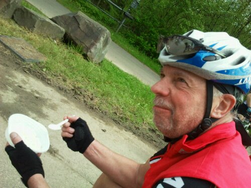 Aber es lief alles in Allem ganz gut. An der Fürwigge vorbei ging es hinunter nach Neumühle zum Abzweig Nordhelle. Hier fuhr jeder sein eigenes Tempo hinauf, um sich oben an der Kontrolle wieder zu treffen. Über eine lange Abfahrt ging es über Meinerzhagen wieder zurück nach Kierspe, um dann wieder auf die uns bekannte Strecke des letzten Jahres zu kommen. An der Aggertalsperre erreichten wir die nächste Kontrolle, wo es sogar Milchreis zu futtern gab…. Ihr wisst schon: Futterluke auf……..