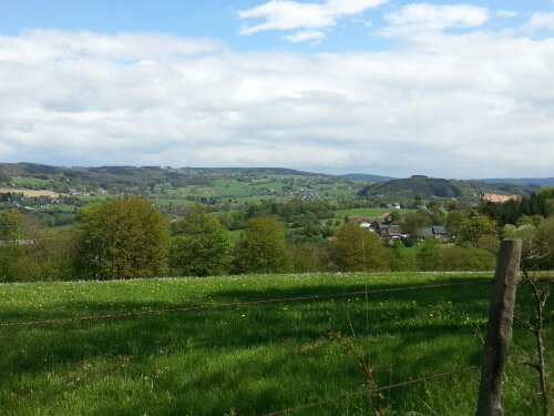 Nach kurzer Erholung mit leichtem Auf und Ab ging es in rauschender Abfahrt in´s Tal der Ambleve, nur um nach Überquerung des Flußes gleich in die nächste Wand zu rauschen. „Den Anstieg kenne ich“ waren Grex Worte, bevor ich ihn nur noch von hinten sehen konnte. Der Cote Chambralles (1550m, Max 20%, Schnitt 9,5) wird auch bei T-B-T gefahren, wo er letztes Jahr teilgenommen hatte. Ich orientierte mich an meinem Puls und merkte hier bereits, daß mir diese brutalen Steigungen lange nicht mehr so gut liegen, wie früher. Aber das half mir jetzt auch nicht. Druck Druck Druck auf´s Pedal um die Steigung hochzuwuchten. Anschließend hatten wir noch knapp über 20 Km bis zur ersten Kontrolle, und das ohne offizielle Steigung. Dafür aber mit vier namenlosen Anstiegen mit regelmäßig 7 – 9 % 😉 Nachdem wir uns im Tal der Aisne bei der ersten Verpflegung versorgt hatten, ging es direkt in den Cote de Roche de Frene. Diesen Anstieg hatte ich leichter in Erinnerung, aber die Daten und meine Beine sprachen eine andere Sprache. 2000m, Max13, Durchschnitt 9,7 saugten die nächsten Körner aus meinen Beinen. Grex fuhr wieder locker etwas weiter vor mir die Berge hoch und genoss die grandiose Landschaft. Aber auch ich erfreute mich den ganzen Tag an der tollen Strecke. 95 Prozent führte durch Feld, Wald und Wiese. Das ganze gepaart mit tollen Aussichten….. ein echtes Highlight….