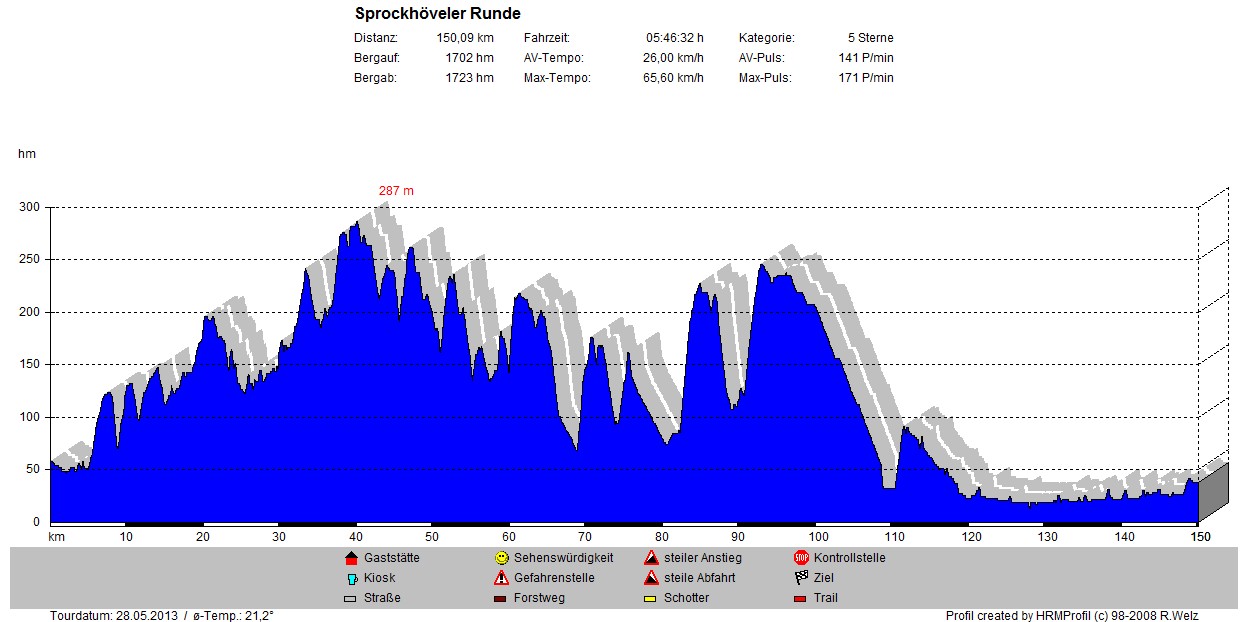 Das tat heute wirklich gut und war auch dringend notwendig 😉 Von Beginn an konnte ich tatsächlich „Kurz-Kurz“ fahren und die wärmenden Sonnenstrahlen auf den Armen und Beinen geniessen. Ich wußte ja kaum noch wie sich das anfühlt 😉 Im Kopf hatte ich mir eine große Runde durch´s Niederbergische mit neuen und mir unbekannten Streckenabschnitten zurechtgelegt. Um es gleich vorweg zu nehmen, die neuen Abschnitte hatten einige Überraschungen parat 😉 ……. und zwar in Form von bis zu 13 % Anstiegen. Das ganze gepaart mit toller Landschaft und schönen Ausblicken….. Dadurch wurde die Schinderei etwas erträglicher. Ich denke, da war ich nicht das letzte Mal. Es gibt dort noch einiges zu entdecken. Nach knapp 110 Km war mit dem Esel der letzte Anstieg des Tages geschafft und ich rollte wie geplant noch durch die Felder in Richtung Angermund. So kam ich nach 150 Km mit 1700 Hm nach 5 3/4 Stunden Fahrzeit zufrieden, aber mit schmerzenden Muskeln wieder Zuhause an. Die Runde durch das Niederbergische hat noch viel Variationsmöglichkeiten und könnte noch eine zusätzliche Option für Klettertouren werden.