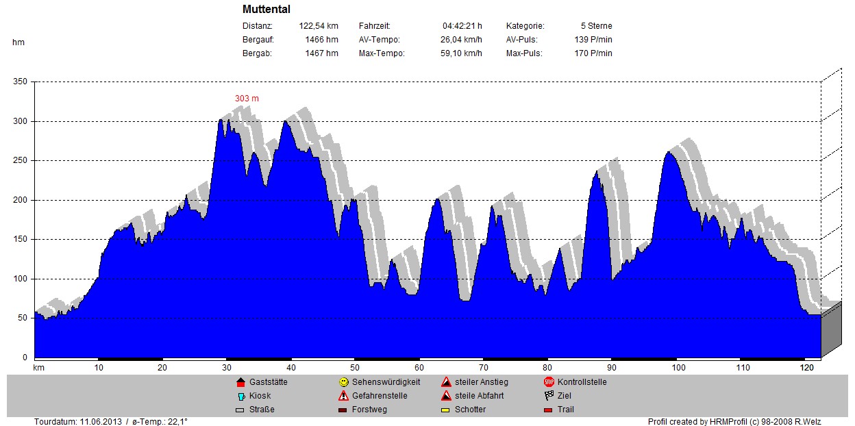 Ich bog auf den Niederbergbahn Radweg ab und rollte nach Wülfrath. Von hier waren es nur noch knapp 20 Km bis nach Hause. Durch die Felder am Golfclub Mettmann gelangte ich nach Metzkausen und später auf die B7. Ab hier war ruhiges Ausfahren bis Gerresheim angesagt. Nach 4:42h waren die 122 km mit 1460 Hm abgespult. Die Runde durchs Muttental ist wieder ein kleines Highlight, weil man phasenweise wirklich alleine durch die Gegend fahren kann. Ich werde jetzt mal sehen, was mein Hintern macht 😉