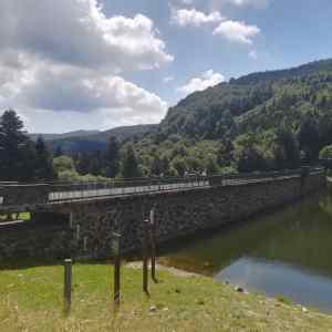 Die 12,3 Km mit etwas über 660 Hm bis Le Markstein beginnen verhältnismäßig flach. Als Trio rollten wir die ersten 3 Km zusammen, ehe der Anstieg so richtig begann. Hier setzte sich das Spiel vom Firstplan fort und ich beobachtete Fabian und Pit, wie sich sich immer weiter entfernten. Ich stapfte den Anstieg hinauf, beobachtete nebenher die Straßenschilder mit Km und Höhenangaben. Die schön geschwungene Straße, mal Sonne, mals Schatten sorgten mit einigen wenigen Kehren immer wieder für Abwechslung, ehe vor mir eine Baustelle auftauchte. Ampelgeregelt und auf eine Spur reduziert. 10 Sekunden vor dem offiziellem Grün fur ich los. Vorne war alles frei, hinter mir ebenso. Mitten in der Baustelle hörte ich plötzlich ein mit hoher Geschwindigkeit herannahendes Auto. „Der wollte bestimmt noch die Ampel bekommen“ waren meine ersten Gedanken, ehe ich der Lautstärke wegen ein wenig Panik bekam. „Hoffentlich übersieht er mich nicht“ Kaum waren die Gedanken zu Ende gedacht, machte ich ein ruckartige Bewegung mit dem Kopf nach links. Ein kurzer stechender Schmerz war die Folge. Der Schmerzpunkt war mir nur zu gut bekannt, hatte ich ihn doch in den letzten Tagen öfter behandeln lassen. Großes Frust machte sich breit. So gut es ging versuchte ich die negativen Gedanken zu verdrängen, als vor mir Fabian und Pit am Ufer des Lac de la Lauch auftauchten. Ich signalisierte ihnen kurz, was mir widerfahren war, machte zwei Bilder und weiter ging es zum Le Markstein. Noch warteten 3,5 Km Anstieg auf uns, die aber bei nachlassendem Baumbestand und auftauchenden Skiliften routiniert abgespult wurden.