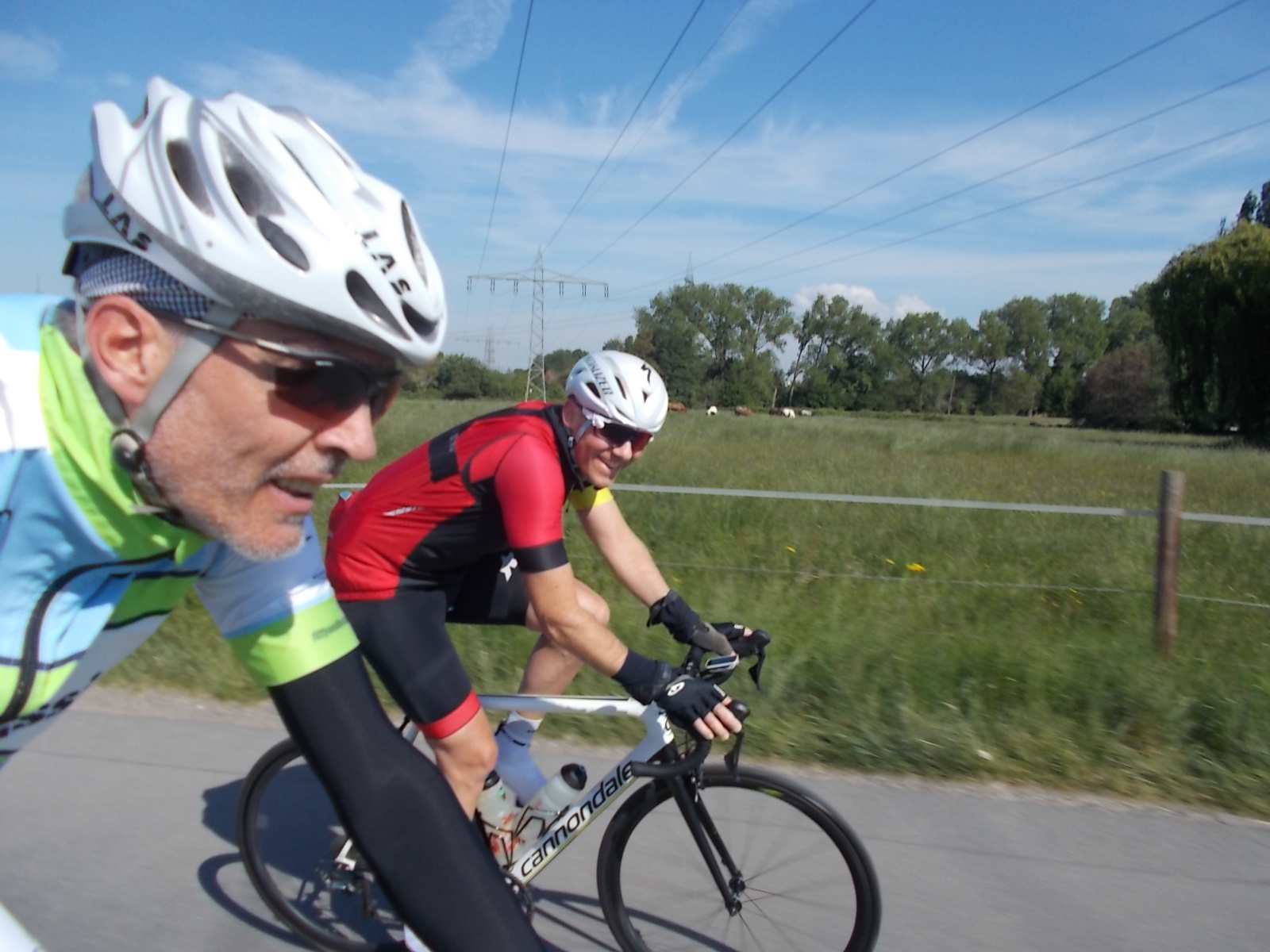 Beim Überraschungsbesuch zu Sandra´s Geburtstag haben Fabian und ich kurzerhand ein Blinddate festgemacht. So kamen es vier Tage später zur gemeinsamen Ausfahrt. Wie verabredet trafen wir uns in Kalkum. Pünktlich traf Fabian dort ein und kurz darauf rollten wir gen Angermund. Bei der Fahrt durch die Felder wurde mir direkt klar, der liebe Jung hat Bums in den Beinen. Ich biss mich fest und rollte bei ordentlichem Speed bis zum Esel. Diesen ging es hinab ins Ruhrtal, wo wir die Stippvisite in Kettwig aber schon nach wenigen Metern wieder beendeten. Als Appetizer wartete der Görscheider auf uns. Fabian zog davon, während ich hochkurbelte 😉 Hier fiel mir auf, dass mein Körperfeeling so gar nicht zur HF passten. Puls knapp über 150 und Beine wie Blei. „Das kann ja heiter werden“ waren meine Gedanken. Aber auch ich kam oben an und weiter gings Richtung Heiligenhaus. Noch vor dem Ortseingang rauschten wir links die Ruhrstraße hinunter, aber nur um auf halben Weg in die Isenbügeler abzubiegen. Kleines Blatt und hoch war meine Devise, bei Fabian ……… ihr wisst schon 😉 Oben gab es ein erstes Gel und etwas Flüssiges aus der Pulle. Windjacke und Armlinge wurde verstaut und schon rollten wir weiter.