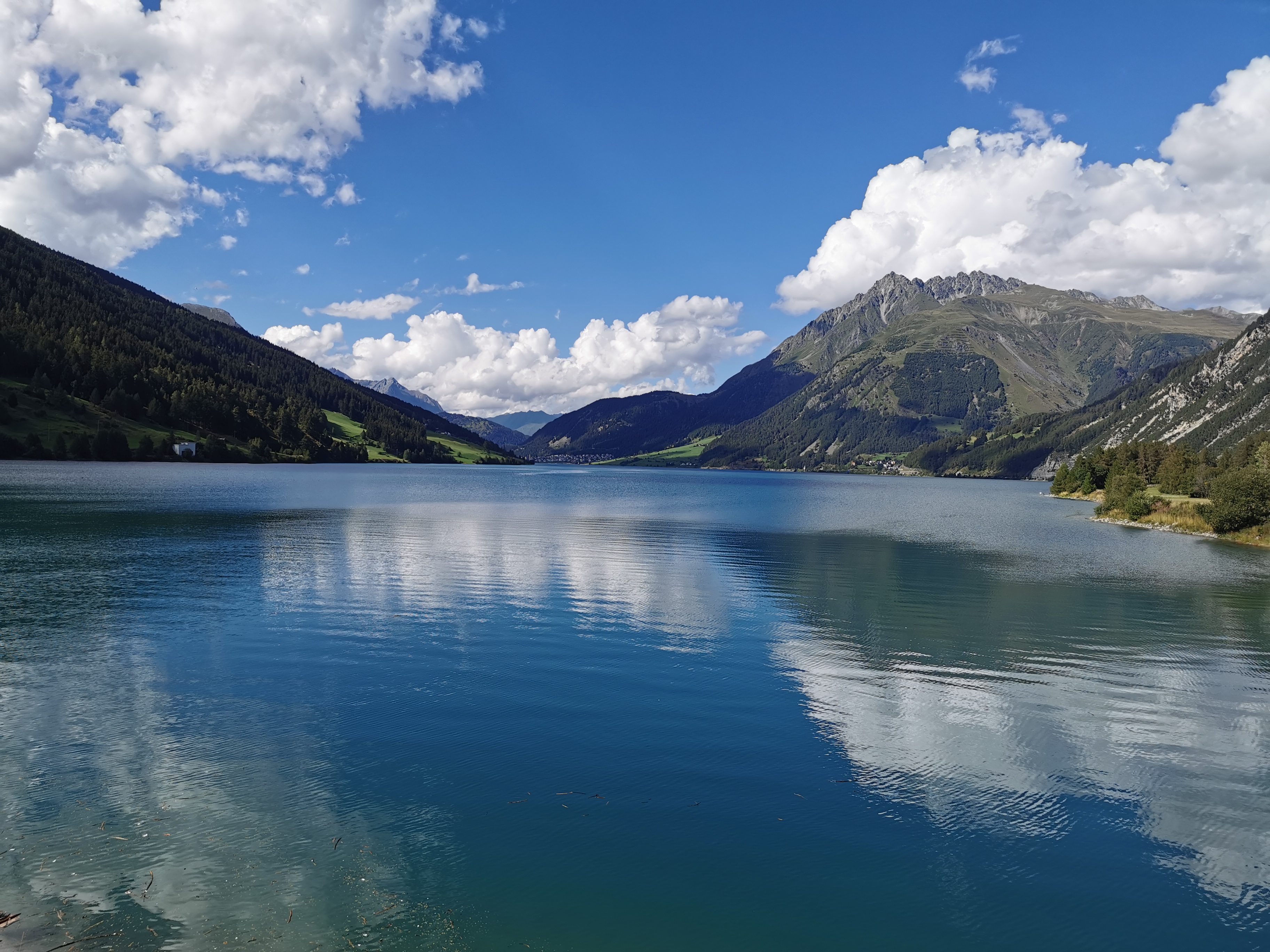 Der Samstag verhieß stabiles Wetter und somit war klar, wohin es uns verschlagen würde: zum Stilfser Joch 😉 Bei idealem Wetter (plus Wochenende) würden wir nicht alleine dort hinauf fahren, aber wir wollten das tolle Wetter nutzen. Zunächst ging es über den gestern erkundeten Radweg zum Reschensee. Voller als gestern, deutete sich bereits hier unsere Vermutung an. Wir sind nicht alleine. Über den Radweg entlang des Reschen und im späteren Verlauf des Haidersees ging es in Richtung Glurns. Hier sollten wir am Nachmittag aus dem Val Müstair wieder auf den Etschtal Radweg treffen. Zu diesem Zeitpunkt machte ich mir schon ein paar Sorgen um meine Beine. 20, 19 und 16% Gefälle hatten wir hinter uns gebracht und mussten diese am Nachmittag wieder zurück. Na prima 🙂