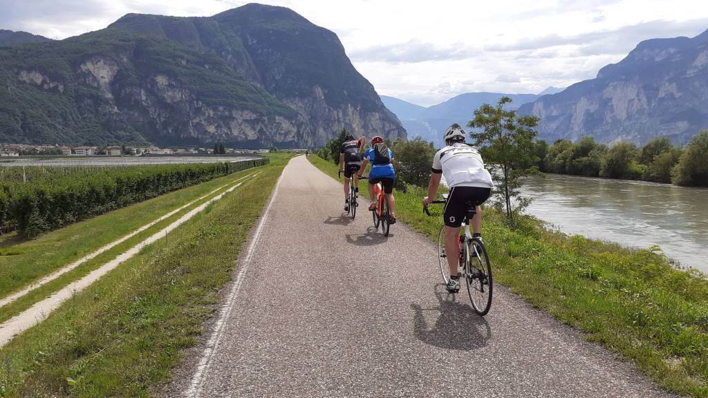 So machten wir uns auf die Runde. Der Radweg entlang der Etsch war schnell gefunden und wir rollten als Trio gemütlich drauf los. Kopf links, Kopf rechts, quasi in Dauerschleife sammelten alle die ersten Eindrücke von der wunderbaren Landschaft. Der Radweg selber ist ein Genuss. Top ausgeschildert, wunderbarer Asphalt, Radlerherz was willst du mehr 😉 Nach 24 Km erreichten wir unser anvisiertes Ziel und staunten nicht schlecht. Die Italiener können Radsport mit allen Sinnen. So eine geile Pausenstation wünschten sich alle auch Zuhause. Einfach genial. Die leeren Mägen wurden mit radsportgerechter Nahrung gefüllt und nach viel Gelächter und Freude war der Unmut über die strapaziöse Anreise verflogen.