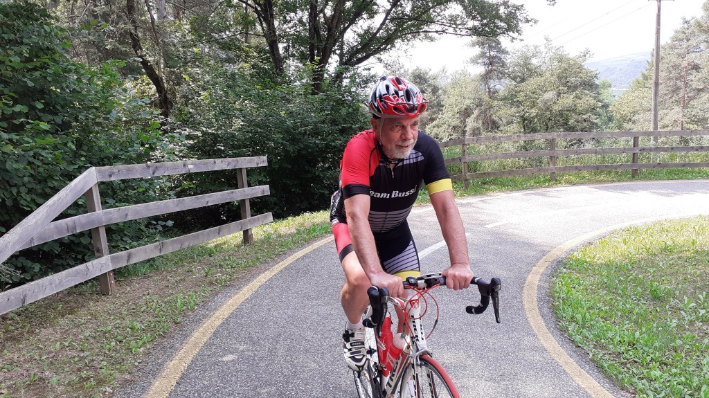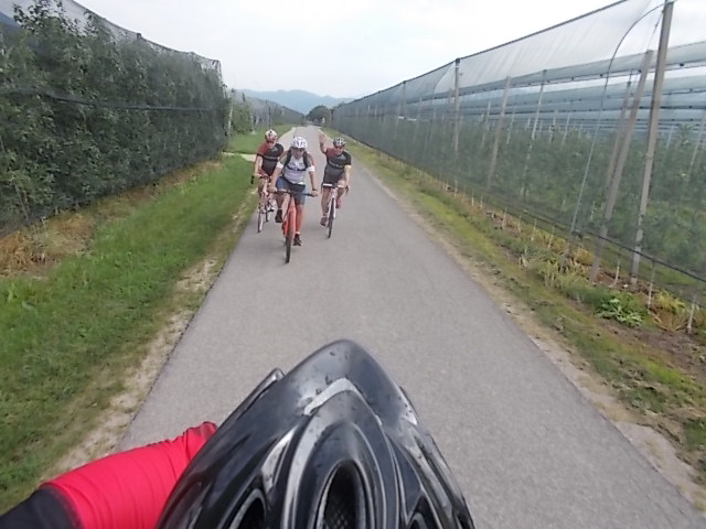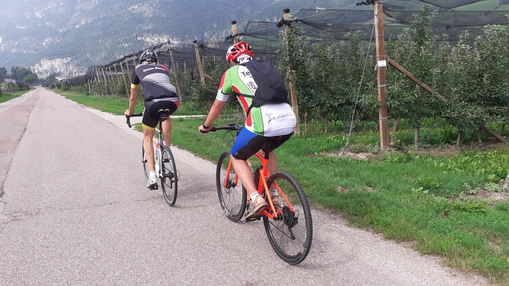 Nach dem Augenkino vom Vortag stand heute wieder Radsport an. Allerdings sorgten die Wetterprognosen für etwas Unruhe. Gewitter und Regen waren vorher gesagt, also hieß es für mich, genau den Himmel zu beobachten. Nach dem Frühstück ging es wie immer gemütlich und entspannt los. Die Tour sollte uns zunächst ins Val di Non führen, dort wollten wir dann ein paar Anstiege unter die Pneus nehmen. Immer mit Blick nach oben und auch auf unsere Beine. So rollten wir zunächst durch die Plantagen, vorbei an Kurtatsch und Magreid. Bei sehr wenig Verkehr rollte es richtig gut. Vor Mezzocorona sorgten die ersten Wellen für ein wenig Abwechslung und steigende Pulswerte 😉 Aber immer noch alles recht entspannt. Die Ortsdurchfahrt ging ruckzuck und ehe wir uns versahen hatten wir bereits das Ende des gesperrten Verbindungsweges erreicht. Hier war verständlicherweise mehr Verkehr, kommen hier doch mehrere Zufahrten aus dem Tal zusammen. Die Straße begann leicht leicht zusteigen, das Fahrerfeld zog sich etwas in die Länge. Am Abzweig in Richtung Vigo di Ton begann der erste geplante Anstieg mit Blick auf das noch höher liegende Kastell di Ton. Bei mir lief es recht ordentlich, die Beine fühlten sich richtig gut an. Entsprechend konnte ich auch ordentlich Druck aufs Pedal bringen. Endlich mal 🙂 Der Anstieg gab auch Blicke über das Tal und den gegenüberliegenden Hang frei, nur die Brenta war im Wolkenhimmel nicht zu sehen.