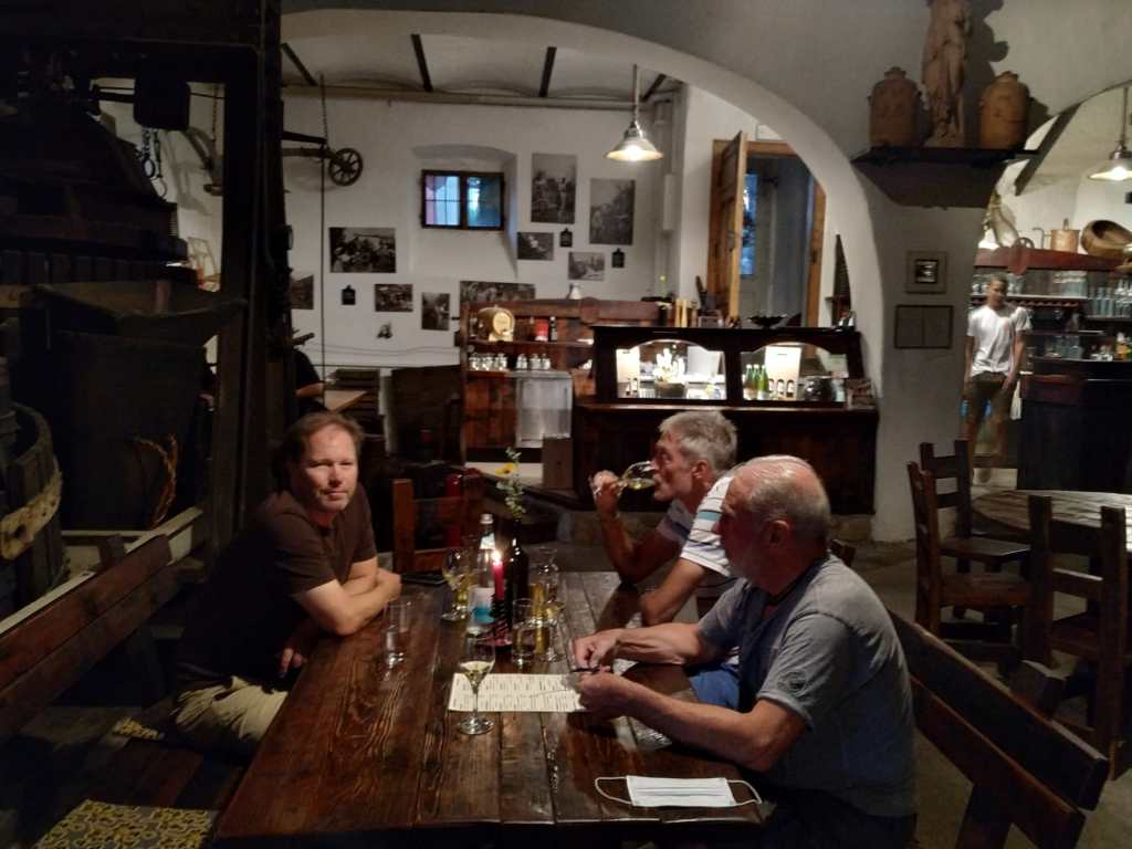 Am Ortsrand von Mollaro sammelten wir uns und beschlossen hier kehrt zu machen. Der Himmel sah nicht gut aus und auf nass werden hatten wir alle keine Lust. Wir rauschten den Radweg wieder runter und verließen das Tal auf bekannten Wegen wieder. Zurück ins Etschtal und ab zum Bici Grill Faedo 😉 Hier schien die Sonne und so machten wir es uns gemütlich. Fitty lud uns zum Mittagsschmaus ein und so verging die Zeit wie im Flug. Ein letztes Mal hieß es Abschied von Sabine nehmen und ab ging die wilde Fahrt. Der Blick in Richtung Tramin war besorgniserregend. Dunkle Wolken hingen über dem Kalterer See und Bozen. Eine Wettfahrt mit dem Regen begann. Immer wieder verloren wir Bernie aus dem Windschatten, schließlich wird es für ihn jenseits der 25 km/h echte Arbeit, aber der Teamspirit siegte. Wir drosselten das Tempo und schleppten ihn mit. Wir schafften es tatsächlich trocken zurück. Am Ortseingang verkündete Bernie plötzlich noch nach Söll und den dahinterliegenden 20% Anstieg in Angriff nehmen zu wollen. Ich wartete kurz auf Fitty und signalisierte ihm, noch hinter den Jungs her zu stiefeln. Gesagte getan. Pit und Bernie immer in Sichtweite drückte ich aufs Pedal und kam langsam immer näher. Die Steigung nahm im weiteren Verlauf auf 15 % zu, was das vorwärtskommen etwas erschwerte. Dennoch schaffte ich es Pit einzuholen. Die Steigung ließ nicht nach und kurz hinter der Dorfkirche verzichteten wir bei wiederholtem Donnergrollen auf die Weiterfahrt. Bernie kam kurz darauf zurück und die ersten Regentropfen fielen vom Himmel. Nix wie runter nach Tramin. Gerade rechtzeitig vor einem ordentlichen Regenguss waren wir wieder unten. Glück gehabt. Bernie ist die Steigung übrigens nicht hoch gefahren. Am Beginn der eigentlichen Herausforderung, dort steht ein Schild mit 25% Angabe, hat er kehrt gemacht 😉 Wir ließen den Abend im >Buschenschank Gamper< gemütlich und fröhlich ausklingen. Auch hier schafften wir den Hin und Rückweg im Trockenen. >Vigo di Ton<