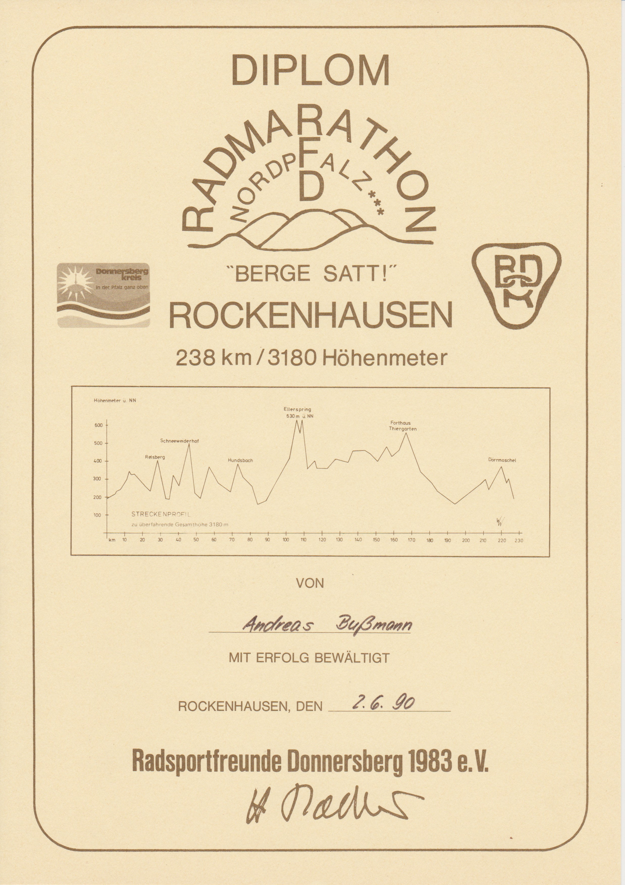 So wurde 1990 das richtungsweisende Jahr. Am 02.06. wollte ich mit 3000 Trainingskilometern am Start des Nordpfalz Radmarathon´s in Rockenhausen stehen. Satte 238 Km und 3180 Hm versprach der Veranstalter. Mitten in der BBall Saison fing ich parallel mit dem Radtraining an. Von Dezember bis März war es die reinste Qual. Ich knappste mir soviel Zeit wie möglich ab, um auch ein paar Radkilometern zu sammeln. Über meine Kondition brauchte ich mir keine Sorgen zu machen, die war zu dieser Zeit Top. Ab März ging es dann auch auf die neu strukturierten RTF´s. Gab es bisher nur 50, 100 oder 150 Km, galten ab dieser Saison 40, 70, 110 und 150 Km als Richtwerte. So sammelte ich fleißig RTF Kilometer und stand Anfang Juni total nervös mit knapp über 3000 Km in Rockenhausen am Start. Der Wettergott meinte es gut mit uns. Temperaturen jenseits der 30 Grad und Sonne satt.