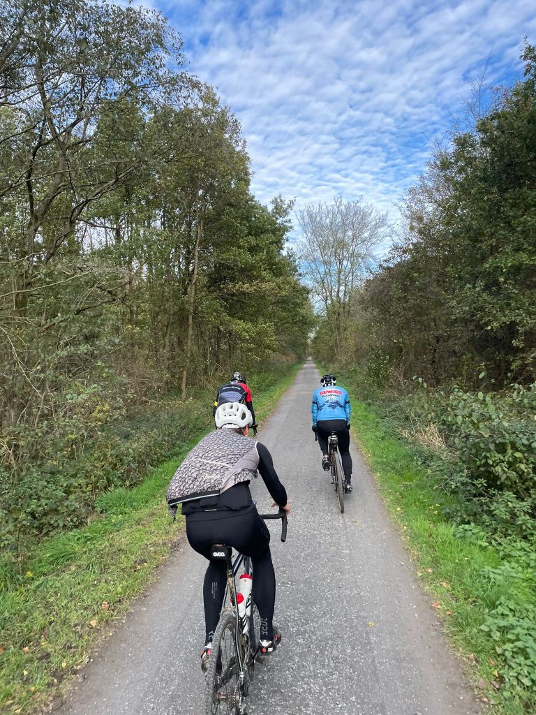 Bei der Fahrt durch die Ausläufer des Uhlenhorst stellten wir wieder mal fest, dass wir hier viel zu selten unterwegs sind. Es gibt noch eine Vielzahl an Wegen, die auf eine Erkundung warten. Ich werde mal eine weitere Tour planen 🙂 Hier war dnn der Wendepunkt erreicht und wir begaben uns somit auf den Rückweg. Durch den Steinderforst, vorbei am GC Mülheim erreichten wir Selbeck, überquerten die B1 und näherten uns somit dem letzten schönen Waldabschnitt des Tages. Ab dem S Bahnhof Hösel folgten wir der Bahnlinie bis Ratingen. Diesen Abschnitt habe ich in den letzten drei Jahrn wirklich lieben gelernt. Es macht mir so einen Spaß auf diesem abwechslungsreichen Abschnitt durch den Wald zu cruisen, der gehört zu einer Gravelrunde in dieser Region einfach dazu. Somit neigte sich die Tour auch langsamdem Ende entgegen. Meine Beine wurden immer leerer, hatte ich diesen Tag doch als kleinen Test genutzt, um weiter das Coronadefizit abzubauen. Am Borner Hof hängten mich meine Mitfahrer locker ab, allerdings hatte ich damit bereits schon vor Fahrtbeginn gerechnet. Die Segelflieger waren leider nicht aktiv, so dass es auch entlang derer Wiese entspannt bis zur Rennbahnstraße weiterrollte. Hier verabschiedeten sich Nedim & Ralf, um die Heimreise gen Kaarst anzutreten. Aber nicht ohne eine weitere gemeinsame Ausfahrt zu planen. Nedim wird die Planung übernehmen und eine Runde im deutsch holländischen Grenzgebiet zusammenstellen. Ich freue mich sehr darauf und bin gespannt, da ich das Gebiet auch schon für mich ins Auge gefasst hatte.