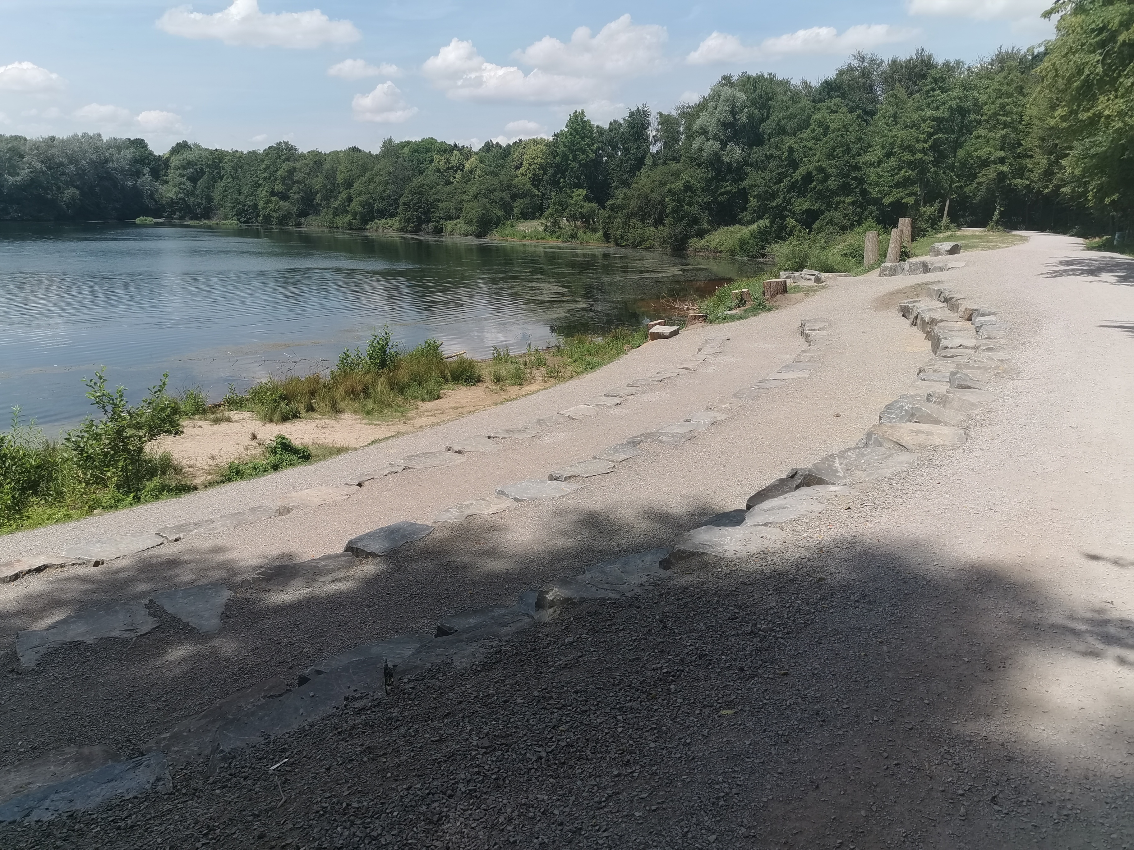 Nach der Pause ging es zunächst am See entlang, um uns wieder ein zu grooven 😉 Bei mir fing hier bereits der rechte Oberschenkel an zu mucken. Keine gute Vorraussetzung um das Priehbachtal rauf zu kurbeln. Ich schaffte es zwar recht ordentlich bis oben, aber die störenden Signale der Beine vermehrten sich. Oben kam dann nach 48 Km und ca 600 Hm der Wunsch auf Verkürzung der Tour sowie Verminderung der Höhenmeter auf. Die Sonne hatte uns weich gekocht und mich zusätzlich noch platt gemacht. Ich plante im Kopf um und so ging es auf direktem Weg durch Nierenhof und Langenberg gen Windrather Tal. Hier begannen die Krämpfe bei mir sehr deutlich und aüßerst schmerzhaft. Zwar schaffte ich es immer wieder, die Dinger raus zu kurbeln, aber jede Bodenwelle holte sie wieder hervor 😦