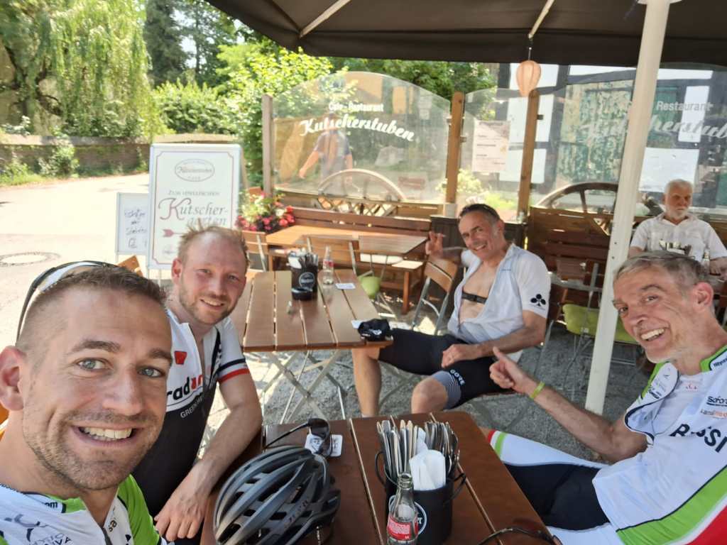 Sonntag morgen trudelten wie vereinbart Rüdiger, sowie Monzi mit Andi bei mir ein. 9:30 Uhr machten wie uns auf die geplante 100Km mit 1000 Hm Tour. Es fing ordentlich an. In Erkrath rollten wir erst einmal die Landstraße hinauf nach Hubbelrath, dann durch die Felder über den Mauerweg runter nach Ratingen. Wir versuchten möglichst entspannt zu bleiben, war es doch schon ordentlich warm. Am Hölenderweg fingen meine Beine das erste Mal an zu meckern. „Müdigkeit“ redete ich mir ein. Hinter Eggerscheidt folgte als nächster Happen der Bruchhauser Weg. Es lief wieder etwas besser und nach der Abfahrt über den Görscheider Weg nach Kettwig, versteckte ich mich im Ruhrtal am Ende der Gruppe, um ein wenig Kraft zu sparen. Monzi drückte ordentlich aufs Gas. Schneller als erhofft rollte ich wieder an die Spitze und wies die Kombo rechts den Kutschenweg hinauf. Monzi kurbelte vorne weg, Rüdiger dahinter, die beiden Andis am Schluß. Die Hitze setzte uns zu, Rüdiger musste kurz vom Rad, alle waren froh irgendwann oben zu sein. Die Aussicht oben am Tannenbusch ist immer wieder schön. Erst recht wenn nach der Abfahrt die Pause am Haus Scheppen wartet. Von allen bereits sehnsüchtig erwartet. Für mich gab es kein EPO, irgendwie bekam ich das dieses Mal nicht runter. Ein erster böser Vorbote 😦