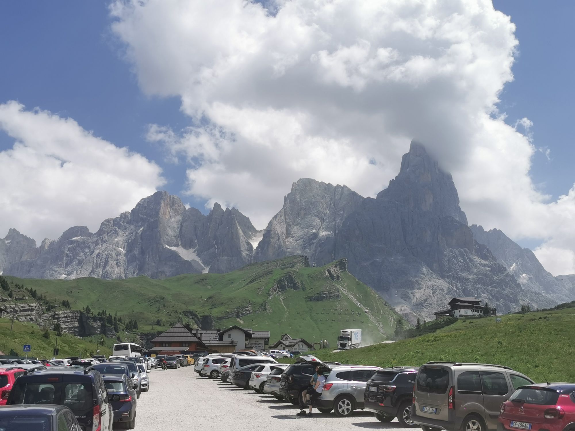 Nach der Pause ging es runter ins Fasstal nach Vigo, um als nächstes Highlight den Rollepass zu erfahren. Allerdings führte uns die Route zunächst über den Passo San Pelegrino & den Passo Valles. Beide Übergänge liegen etwas abseits der Hauptrouten und sind deshalb auch nicht so überlaufen. Auf beiden Pässen hielten wir für die obligatorischen Fotos & Spaziergänge, verzichteten aber auf die Getränke. Die Mittagspause machten wir im Anschluß auf dem Passo Rolle mit Blick auf den mächtigen Pale. Essen und Ausblick waren einfach herrlich. Die Rückfahrt durchs Fassatal rundeten wir noch mit der Umfahrung des Trudener Horn ab, der Aussichtsberg, auf den wir jeden Tag vom Balkon aus blicken 🙂