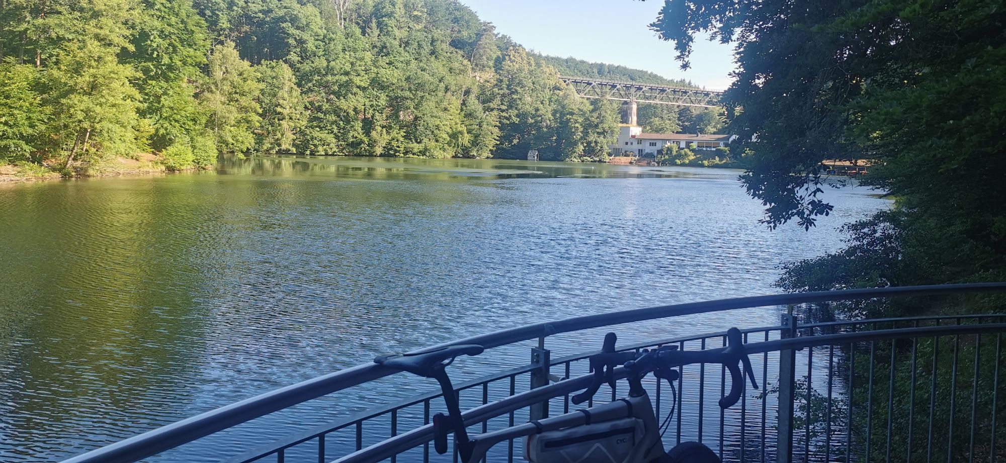 „Der Tag ist noch lang“ sagte ich mir. Also einfach weiter machen und die Gegend genießen. Nach einem Stück entlang der L395 ging es wieder in die Natur. Es wurde in allen Bereichen abwechslungreicher und schöner. Eintauchen in die Natur, Landschaft genießen, die Stille im Wald, alles Dinge die ich so Liebe und weshalb ich mittlerweile so oft auf Claudio sitze. Später folgte ich einer alten Bahnlinie durch den Wald und erreichte nach 26 km den Eiswoog. Da hätte ich glatt schon hinein springen können, so einladend wirkte er auf mich. Aber ich wollte weiter. Die Kühle des Morgens weiter nutzen 😉 Auf den nächsten Km tauchte ich komplett im Wald ab. Genau so hatte ich mir das vorgestellt. Ich cruiste durch die Gegend und wurde nach 42 Km im Örtchen Frankenstein vom Wald ausgespuckt. Zivilisation, wo ich im Vorfeld eine Verpflegungspause geplant hatte. Aber so euphorisch und glücklich wie ich zu diesem Zeitpunkt war, fuhr ich weiter.